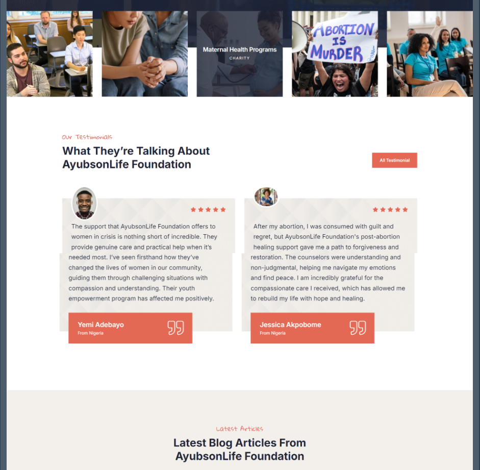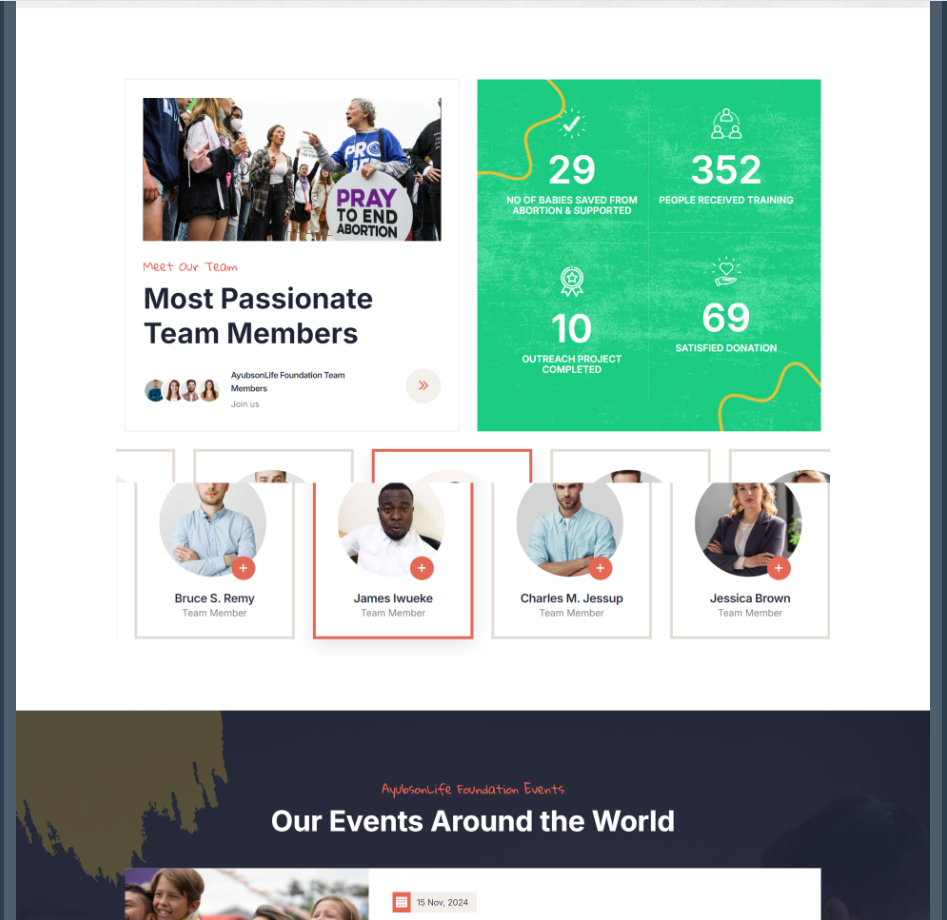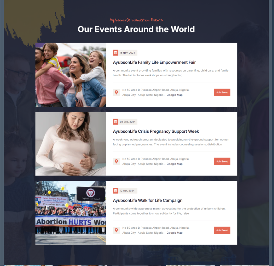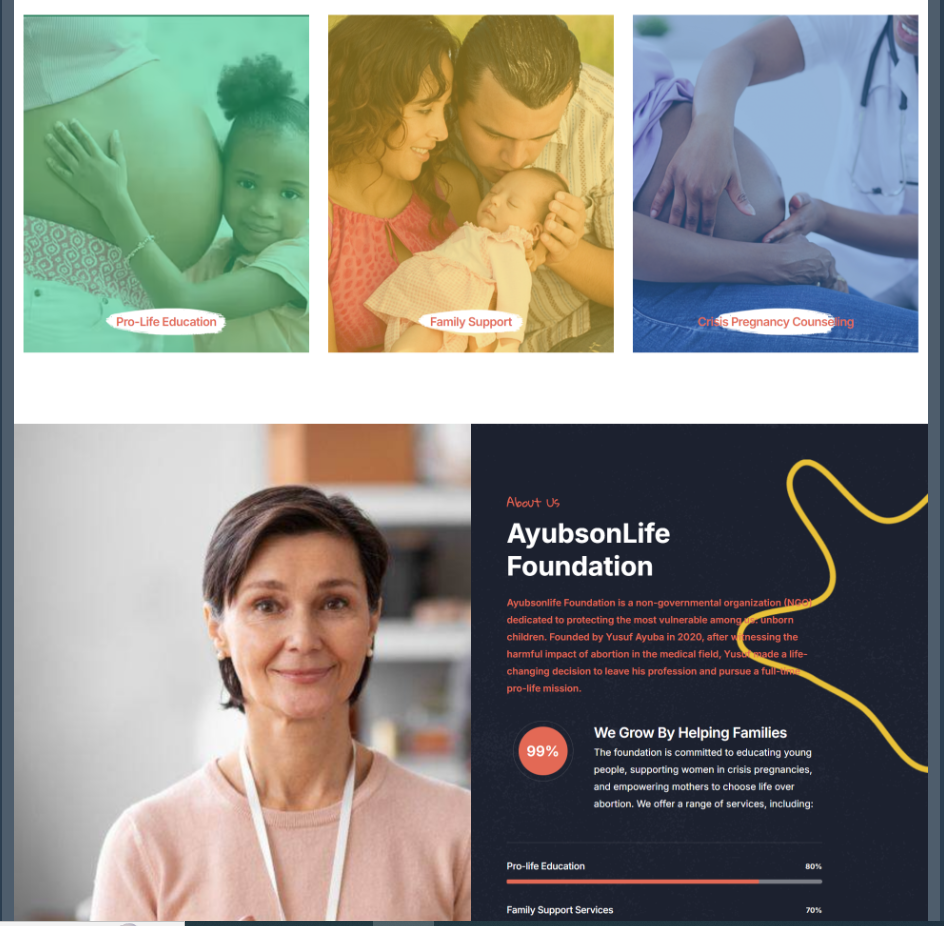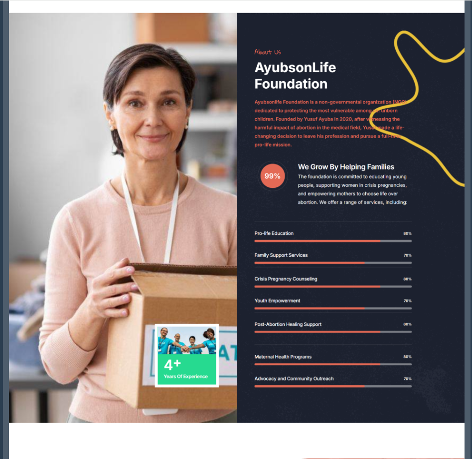 About Us Section: The “About Us” section showcased the story of Yusuf Ayuba’s transformation from a medical professional to a pro-life advocate, along with the foundation’s vision and values. A timeline of the foundation’s milestones helped illustrate its growth and impact.