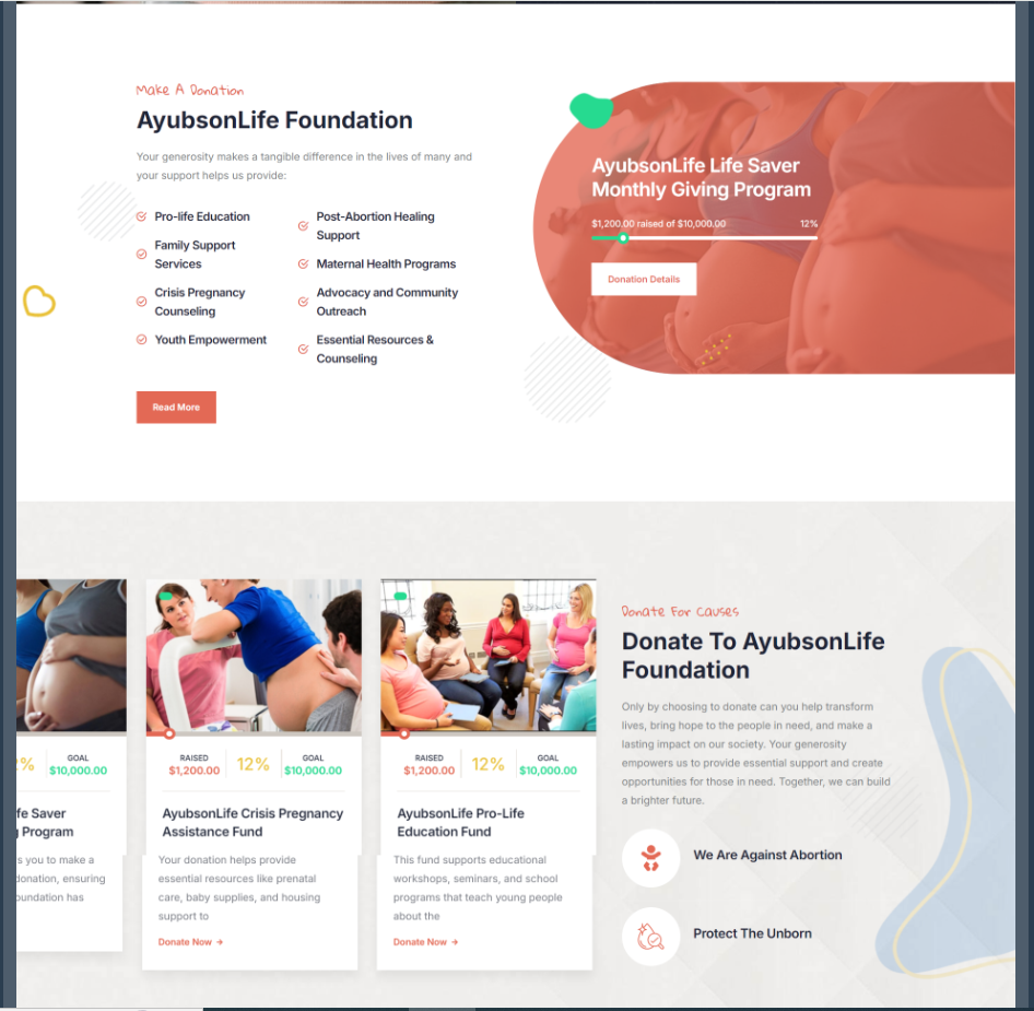 Services Section: A dedicated section was built to detail the foundation’s various programs, such as counseling for women in crisis pregnancies, educational workshops for young people, and support for mothers who choose life. Each service was accompanied by testimonials and real-life success stories to reinforce the positive outcomes of the foundation’s work.